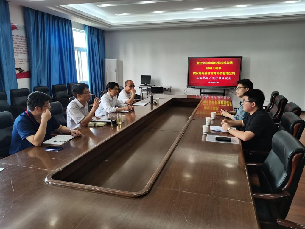 郝玉龙)5月21日,bat365机电工程系在南湖校区机电楼会议室召开“工业机器人英才班”订单培养洽谈会,武汉咚咚英才教育科技有限公司、机电工程系负责人及工业机器人专业负责人参加洽谈。