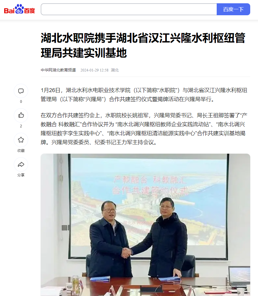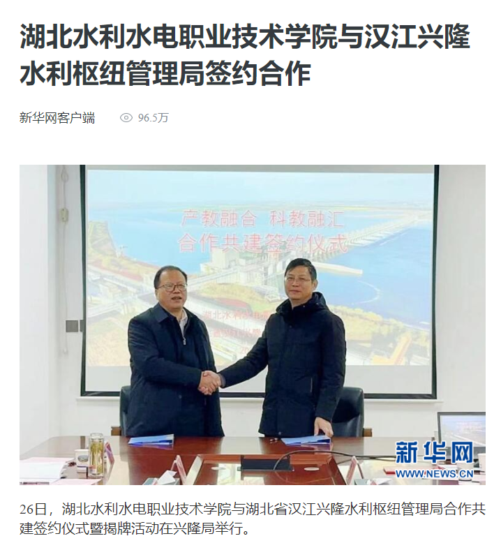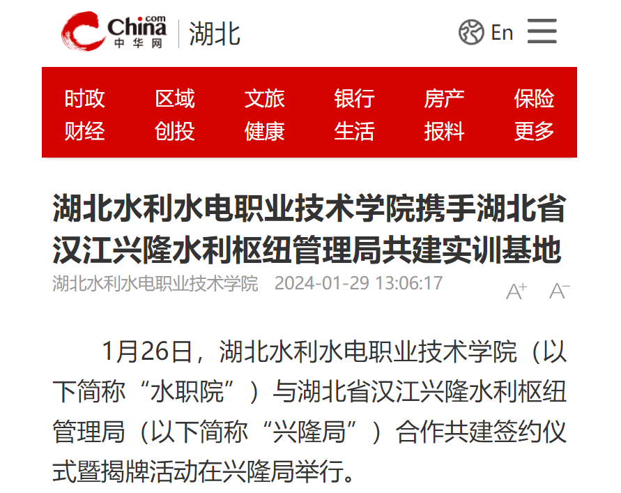 1月29日,中华网以《bat365中文官方网站携手湖北省汉江兴隆水利枢纽管理局共建实训基地》为题,对学院与汉江兴隆水利枢纽管理局签约合作进行报道。