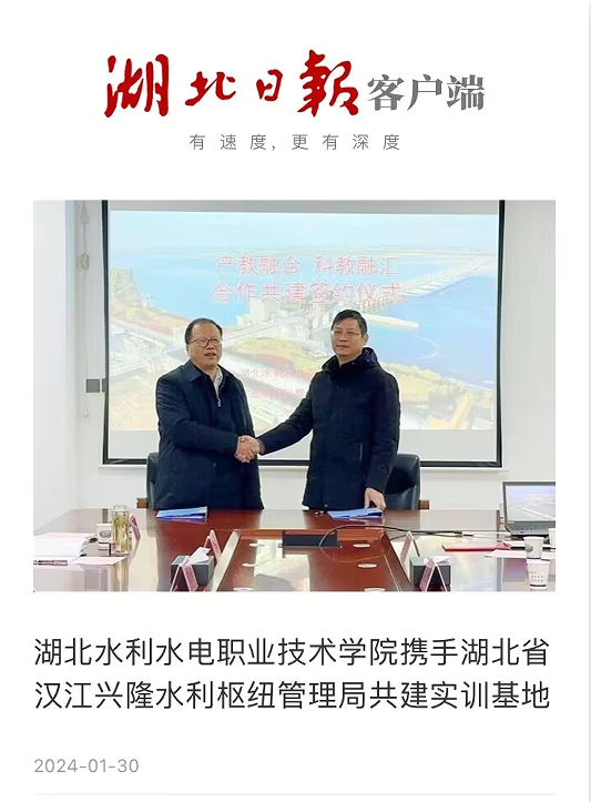 1月30日,《湖北日报》以《bat365中文官方网站携手湖北省汉江兴隆水利枢纽管理局共建实训基地》为题,对学院与汉江兴隆水利枢纽管理局签约合作进行报道。