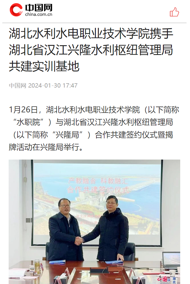 1月30日,中国网以《bat365中文官方网站携手湖北省汉江兴隆水利枢纽管理局共建实训基地》为题,对学院与汉江兴隆水利枢纽管理局签约合作进行报道。