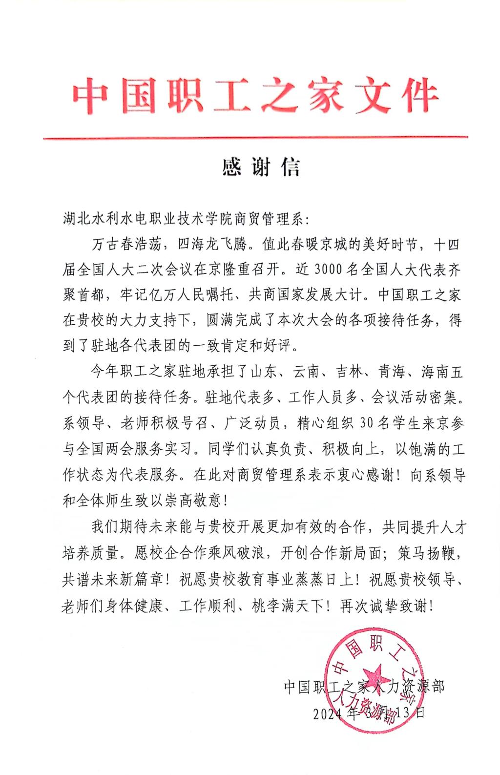 近日,学院商贸管理系收到了由中国职工之家发来的感谢信。感谢学院商贸管理系积极号召、广泛动员,精心组织了30名学生赴京参与全国两会服务,表扬了bat365商贸管理系学子在参与全国两会服务实习期间,认真负责的工作态度和扎实过硬的专业技能。
