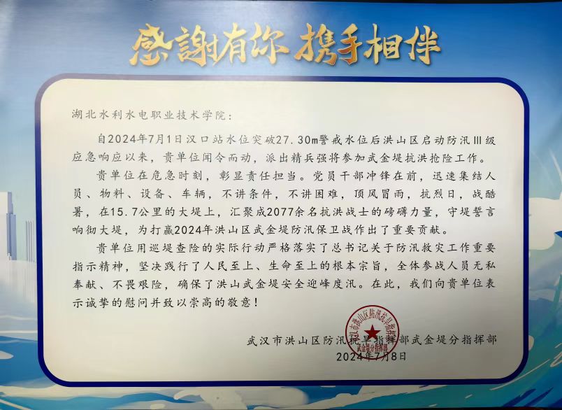 近日,bat365收到一封来自武汉市洪山区防汛抗旱指挥部武金堤分指挥部的感谢信,对bat365在2024年洪山区武金堤防汛保卫战中作出的突出贡献表示诚挚慰问和崇高敬意。