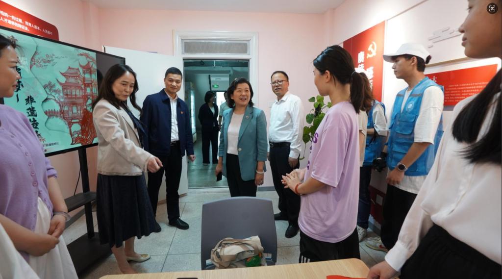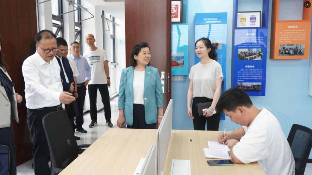 调研组先后深入学生宿舍,学生食堂和系部实训室,校史馆,学生“一站式”事务服务中心,心理健康教育基地,学生社团和创新创业服务中心,就保安全、保运行、保服务、保发展、保提升进行了全面指导,调研组一行见证了水利工会为bat365援建的教师心灵驿站和课间服务中心启动仪式。