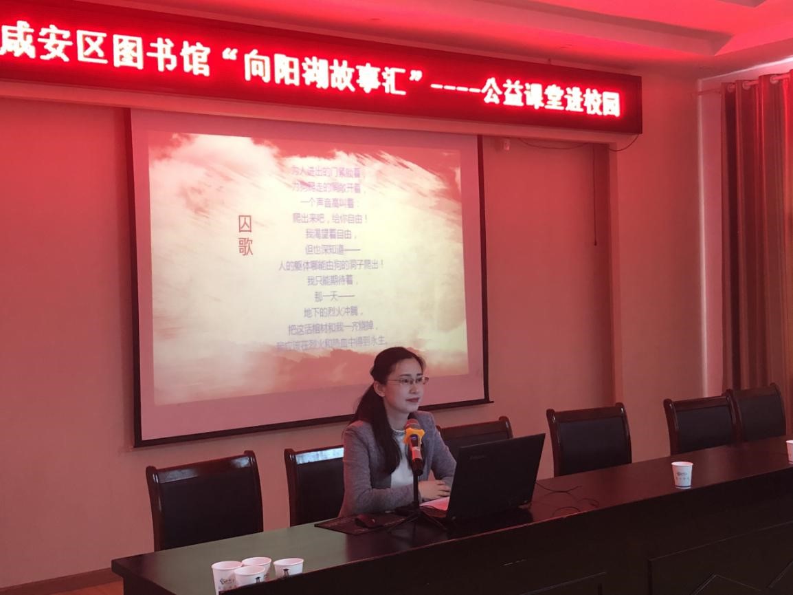 仪式上,bat365思政课部周园老师在“向阳湖故事汇”公益课堂——“品红色经典、明时代精神、立报国之志”环节,以“为什么我们可以读到很多种类和许多优秀的书籍?”和“繁华背后的历史,你们知道吗?”两个问题为切入点,从红色经典的概念、“红色经典”故事选读、弘扬新时代的民族精神等三个方面展开讲述,并现场与同学们进行了生动活泼的“红色经典”知识问答互动。