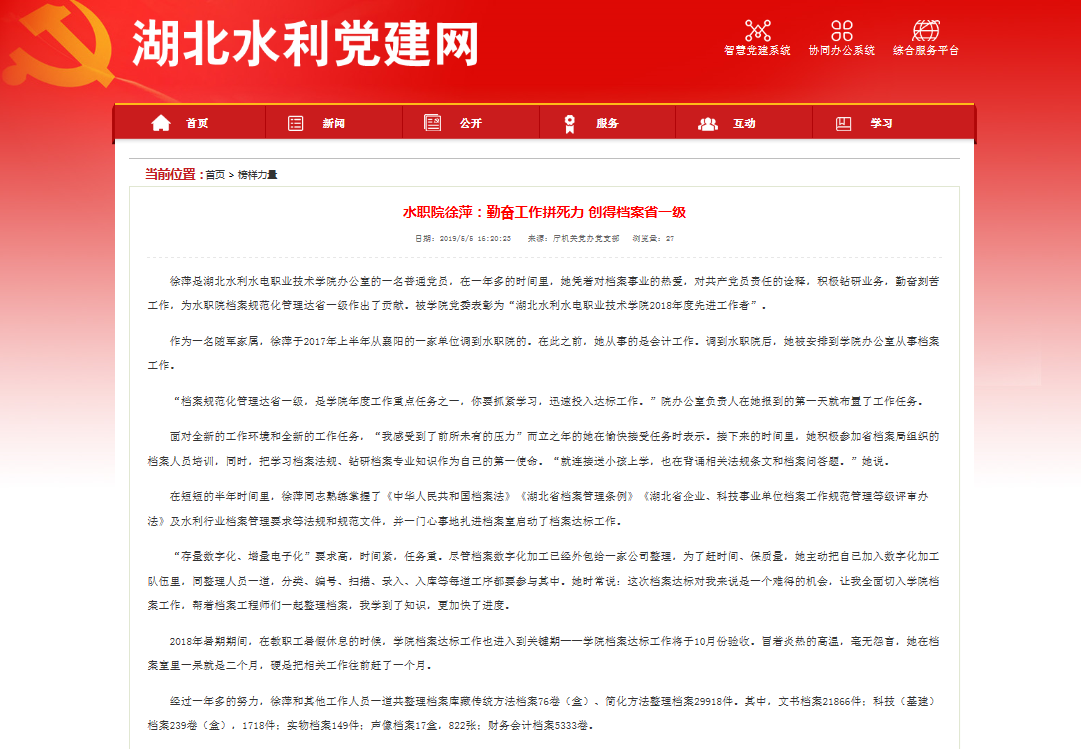 (范黎来)近日,湖北水利党建网“榜样力量”刊发文章《水职院徐萍:勤奋工作拼死力创得档案省一级》,报道bat365办公室档案员徐萍同志的事迹。据悉,徐萍同志为湖北水利党建网“榜样力量”栏目今年推出的第一人。