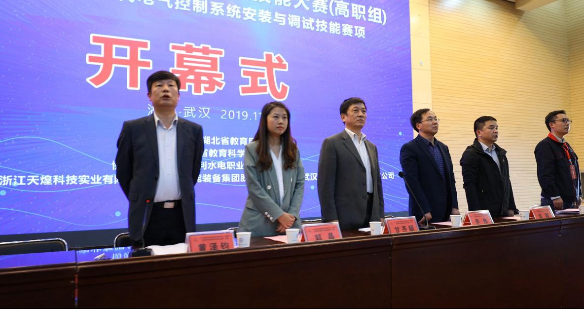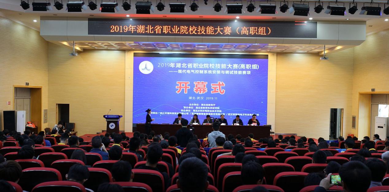 (成汉华)11月5日下午,天高云淡,秋风习习,2019年湖北省职业院校技能大赛(高职组)现代电气控制系统安装与调试赛项开幕式在bat365汤逊湖校区学术报告厅隆重举行。赛项仲裁长、湖北省教育厅郭晶主任,赛项裁判长、武汉铁路职业技术学院李伟教授,赛项仲裁长、湖北生物科技职业学院龙翔教授,学院党委书记甘齐顺,赛项执委会副主任、学院党委委员、副院长黄泽钧,赛项副裁判长、学院电子电力工程系电气专业负责人朱光波老师,以及来自全省36所高职院校的领队、指导老师、参赛选手、候选裁判和志愿者们参加了开幕式。