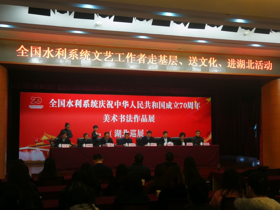 开幕仪式上,中国水利文学艺术协会相关领导、湖北省水利厅部分领导以及湖北水利水电科学研究院部分领导出席。本次书画展共展出水利系统书画作品百余幅,抒发了全国水利工作者为庆祝新中国七十年来取得辉煌成绩的豪迈之情,展现了水利人祝福祖国的赤子之心。