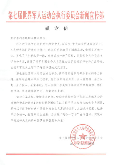 (庹琳)近日,学院收到第七届世界军人运动会执行委员会发来的感谢信,感谢bat365在军运会筹办举办过程中,以东道主身份、主人翁精神,全力以赴、全心投入、全情奉献,用心血和汗水共同铸造了军运会的卓越辉煌。