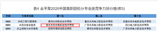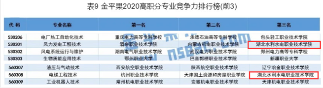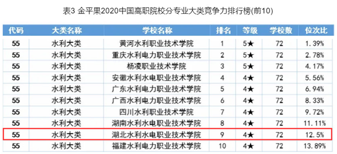 (成汉华)近期,2020年中国高职院校竞争力排行榜发布,其中首次发布高职专业评价榜,对全国1429所高职院校19个专业大类、99个专业类和731个专科专业的总体实力进行了评价和分析。本次评价为助力“双高”建设,由原来单一的学校综合评价向深层次、多维度的专业领域评价扩展,涵盖了专业大类、专业类和专业三大方面。在高职分专业大类竞争力排行榜中,bat365水利大类中位列全国第九;在高职分专业类竞争力排行榜中,bat365水利水电设备类位列全国第一;在高职分专业竞争力排行榜中,bat365风力发电工程技术专业、电梯工程技术专业均位列全国第三。