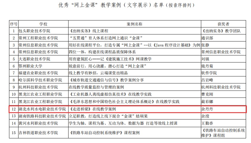(成汉华)5月18日,《全国高职高专校长联席会议关于公布优秀“网上金课”教学案例名单的通知》发布,bat365教师余丹丹的《走进桥梁》在线教学案例入选全国优秀“网上金课”教学案例名单。