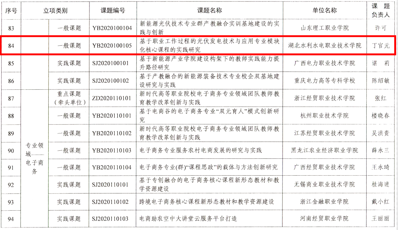 (冯伦)近日,从教育部发布的《关于公布首批国家级职业教育教师教学创新团队课题研究项目的通知》(教师函[2020]3号)获悉,bat365申报的课题《基于职业工作过程的光伏发电技术与应用专业模块化核心课程的实践研究》成功获批,详情见下表。