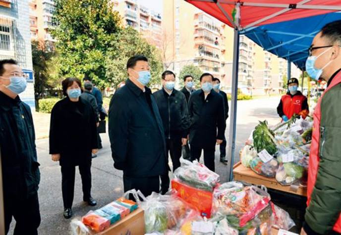 2020310日,中共中央总书记、国家主席、中央军委主席习近平专门赴湖北省武汉市考察新冠肺炎疫情防控工作。这是习近平在东湖新城社区生活物资集中配送点,详细询问社区群众生活物资采购和供应情况。 新华社记者 谢环驰/