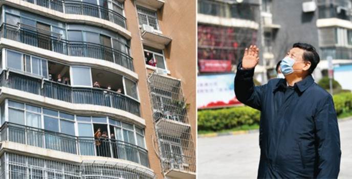 2020310日,中共中央总书记、国家主席、中央军委主席习近平专门赴湖北省武汉市考察新冠肺炎疫情防控工作。这是习近平在东湖新城社区考察时,向在家隔离居住的居民挥手致意、表示慰问(拼版照片)。 新华社记者 谢环驰/