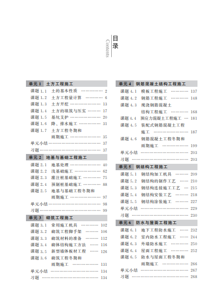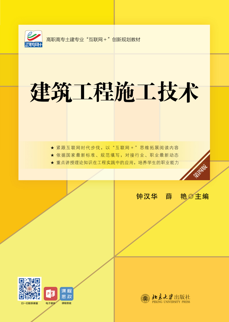 本书是按照高等职业教育土建类专业的教学要求,以国家现行建设工程标准、规范和规程为依据,以二级造价师职业岗位能力的培养为导向,根据编者多年的工作经验和教学实践,在前三版教材的基础上修改、补充编撰而成。本书对建筑工程施工工序、工艺、质量标准等做了详细的阐述,坚持以就业为导向,突出实用性、实践性;吸取了建筑施工的新技术、新工艺、新方法,其内容的深度和难度符合高等职业教育的特点,重点讲授理论知识在工程实践中的应用,培养高等职业院校学生的职业能力;内容通俗易懂,叙述规范、简练,图文并茂。全书共分8个单元,包括土方工程施工、地基与基础工程施工、砌筑工程施工、钢筋混凝土结构工程施工、钢结构工程施工、防水与屋面工程施工、装饰工程施工和数字化施工。