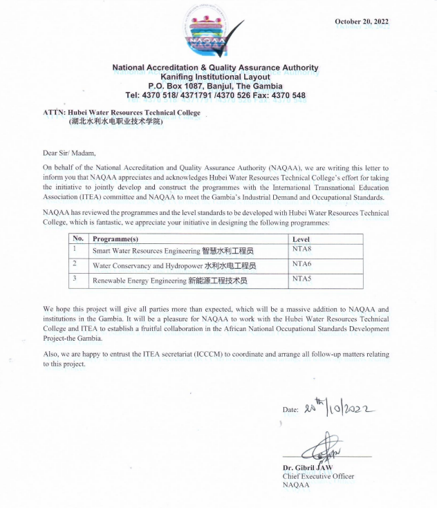 经项目汇报、专家评审等环节,冈比亚教育部审核,水利水电工程员、智慧水利工程员、新能源工程技术员(太阳能)三个职业岗位成功入选。