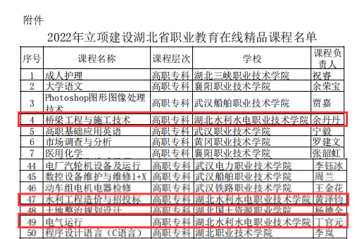 本次入选省级职业教育在线精品课程建设的分别是余丹丹教授主持的《桥梁工程与施工技术》、黄泽钧教授主持的《水利工程造价与招投标》和丁官元教授主持的《电气运行》等3门课程.其中《桥梁工程与施工技术》同时作为国家在线精品开放课程在本次也顺利通过复核。3门课程作为bat365在线精品课程建设的代表,能够很好的适应当前职业教育线上线下教学创新融合新常态,在课程资源建设、课程应用推广以及基于课程特点的教法学法改革上均起到了很好的示范引领作用。