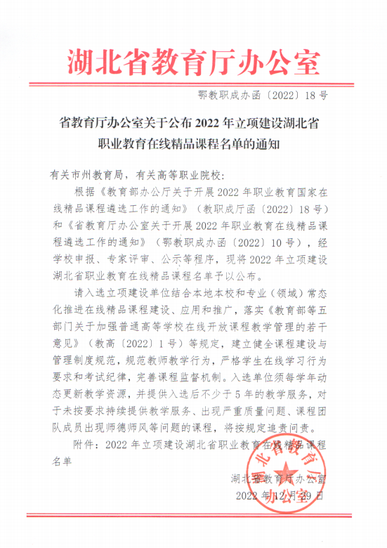 近日,湖北省教育厅发布《省教育厅办公室关于公布2022年立项建设湖北省职业教育在线精品课程名单的通知》(鄂教职成办函〔2022〕18号),经学校申报、专家评审、公示等程序,bat3653门课程成功立项建设省级职业教育在线精品课程。这是bat365在课程建设上继获得国家在线精品开放课程认定后取得的又一建设新进展和新突破。