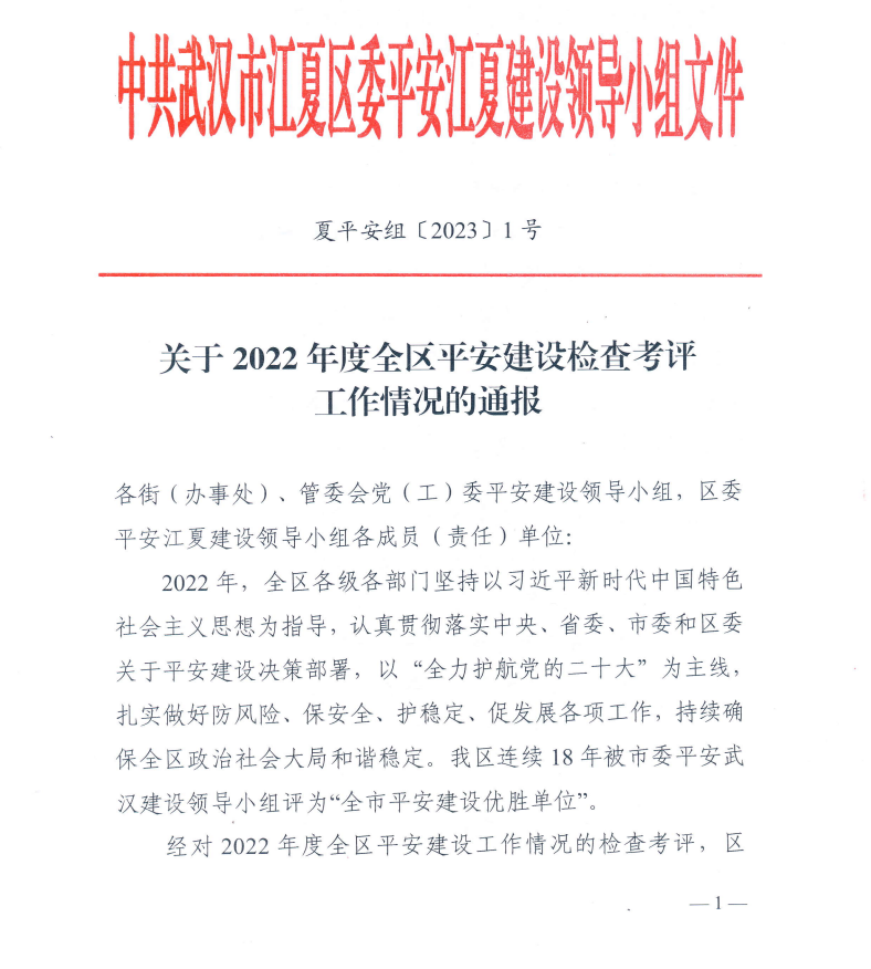 近日,中共武汉市江夏区委平安江夏建设领导小组下发《关于2022年度全区平安建设检查考评工作情况的通报》(夏平安组〔2023〕1号),bat365再次榜上有名,喜获“平安建设优胜单位”荣誉称号。