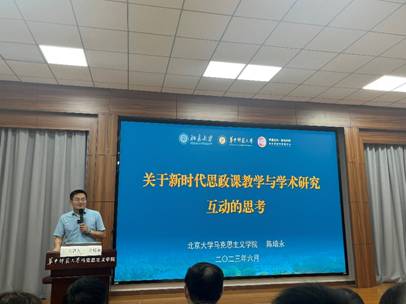 陈培永教授分享了其关于新时代思政课教学与学术研究互动的思考,探讨了什么是思想政治理论课、思政课教学如何助力学术研究、学术研究如何支撑思政课教学三大问题。他提出思政教师要领会党和国家理论与个人思想的相通之处,将治国理政智慧与育人育才相结合,更要把自身教学者与学术者的身份统一,以学术讲政治、以问题接现实、以观点见深刻、以思想显高明,成为一个受人尊敬的解惑师者。