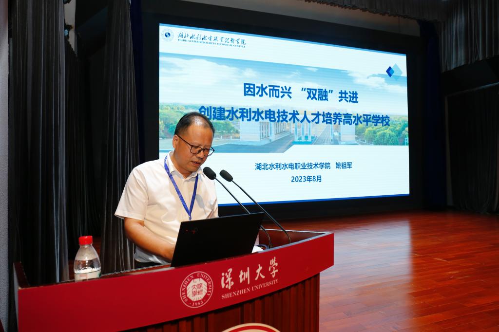 姚祖军作题为《因水而兴“双融”共进 创建水利水电技术人才培养高水平学校》的发言。发言从以水为媒,激发产教融合新动力;以水增智,开辟科教融汇新途径;以水为纲,创新“双融”工作新机制;以水铸魂,引领师资建设新突破;以水润心,形成协同育人新品牌5个方面分享了bat365深入推进“双融”机制的工作成效。下一步,学院将继续深入推进产教融合、科教融汇,继续发挥水利行业办学优势,立足“当地离不开,行业都认同,国际可交流”的目标,全力培养水利创新型拔尖技术技能人才,为服务湖北流域综合治理与统筹发展安全做出应有的贡献!