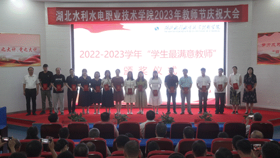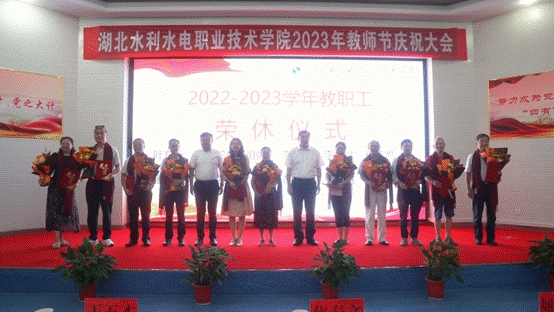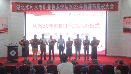 大会对2022-2023学年“学生最满意教师”进行了表彰向从教三十年教职工和2022-2023年度退休教职工献花并颁发证书。