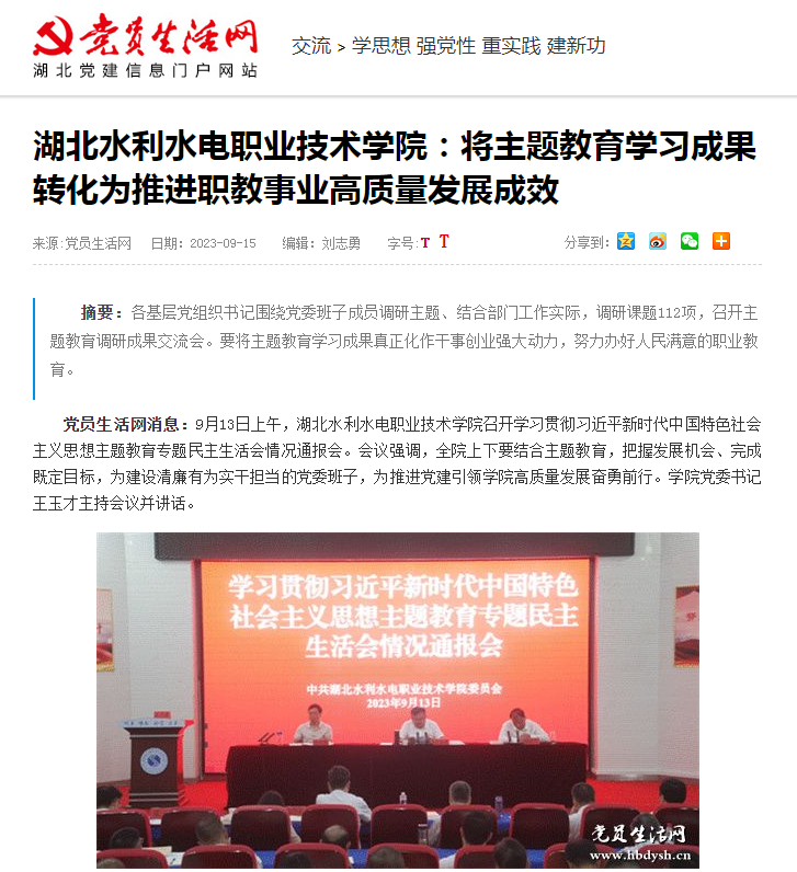 9月15日,湖北党建信息门户网站党员生活网转载bat365新闻《学院将主题教育学习成果转化为推进职教事业高质量发展成效》。
