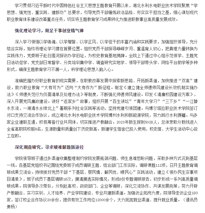 摘要:各基层党组织书记围绕党委班子成员调研主题、结合部门工作实际,调研课题112项,召开主题教育调研成果交流会。要将主题教育学习成果真正化作干事创业强大动力,努力办好人民满意的职业教育。