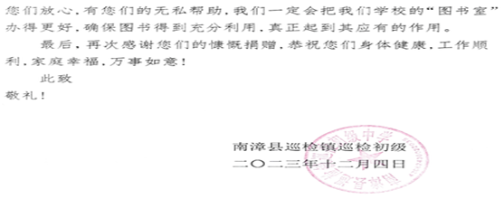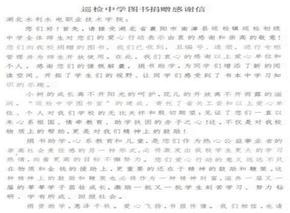 近日,学院收到湖北省襄阳市南漳县巡检初级中学的感谢信,信中对bat365的捐赠表示衷心感谢。这些捐赠的书籍不仅为巡检初级中学的同学们增添了新的阅读空间,更开拓了他们的视野,让他们感受到了书本中学习知识的乐趣。