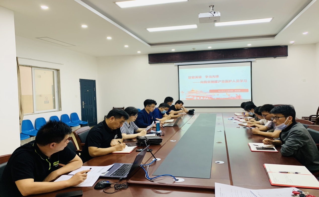 (电力电子工程系第二党支部)5月26日,电力电子工程系第二党支部开展了“致敬英雄 争当先锋----向我省驰援沪吉医护人员学习”的主题党日活动。此次主题活动特邀请校企合作单位武汉爱疆科技有限公司的三位党员共同参与学习。