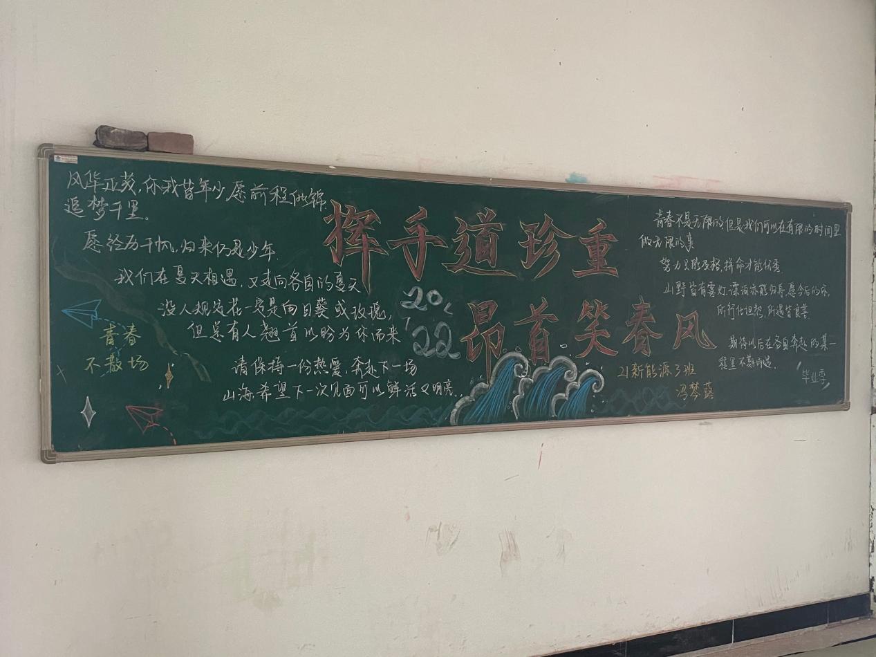 黑板报是学校、班级宣传教育的重要阵地,也是学生学习实践的重要场所。一直以来,机电工程系团委一直十分重视宣传阵地“黑板报”的建设。活动以班级为单位进行黑板报创作,21级的同学们在这一轮的黑板报创作中融入自己对学长学姐们毕业的美好祝愿,“心中有阳光,脚下有力量,为了理想能坚持、不懈怠,才能创造无愧于时代的人生”。