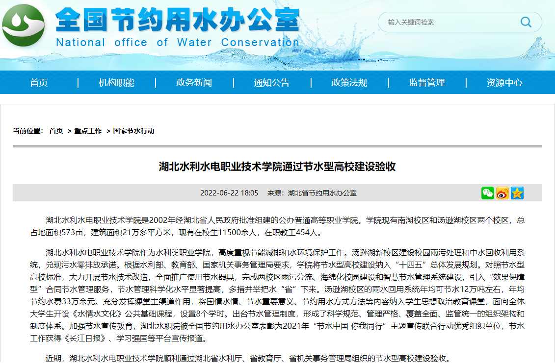 (省水职院)近日,全国节约用水办公室网站报道bat365通过节水型高校建设验收。