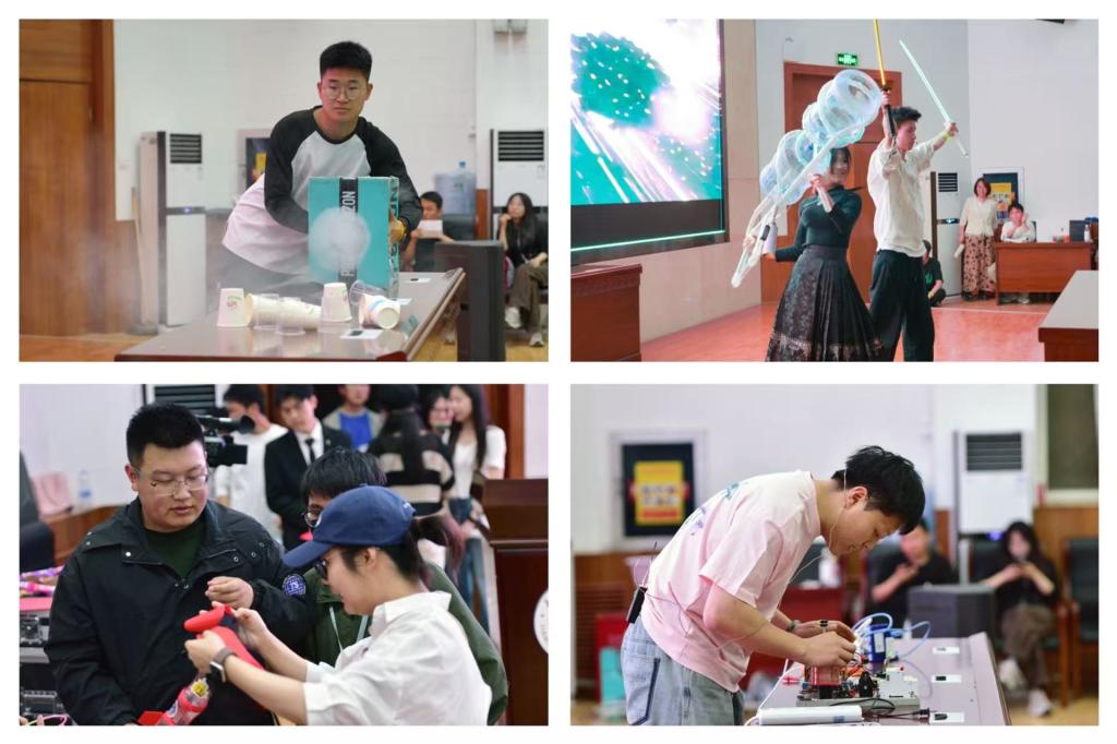 汇报展示活动中,2021级物理学专业学生共展出创作的教具作品20余件,涵盖力学、光学、电磁学、热学等。其中,《张拉整体装置》以巧妙的力学平衡设计诠释了“平衡即艺术”的工程美学;《声波可视化教具》通过气球的振动轨迹将无形的声波转化为视觉盛宴;《变压器演示仪》以直观的线圈闪烁揭示了电磁感应的奥秘;《水火箭》则以废弃塑料瓶为箭体,通过气压式喷水推进的动感实验,将牛顿第三定律的作用力与反作用力原理演绎成一飞冲天的视觉奇观,其多级分离设计与垂直回收模拟更以低成本材料实现航天力学的具象化表达。此外,短剧《电学三兄弟的“职场”风波》以幽默情景剧形式演绎电路原理,将抽象的物理知识转化为生动的职场博弈;《光的双缝干涉实验》用跃动条纹揭示波动本质;《空气炮》则以气流击碎纸杯塔的瞬间震撼诠释伯努利原理,赢得现场阵阵掌声;《脉冲炮》更是做到了“理论与实践的绝妙结合,科技与艺术的完美碰撞”。