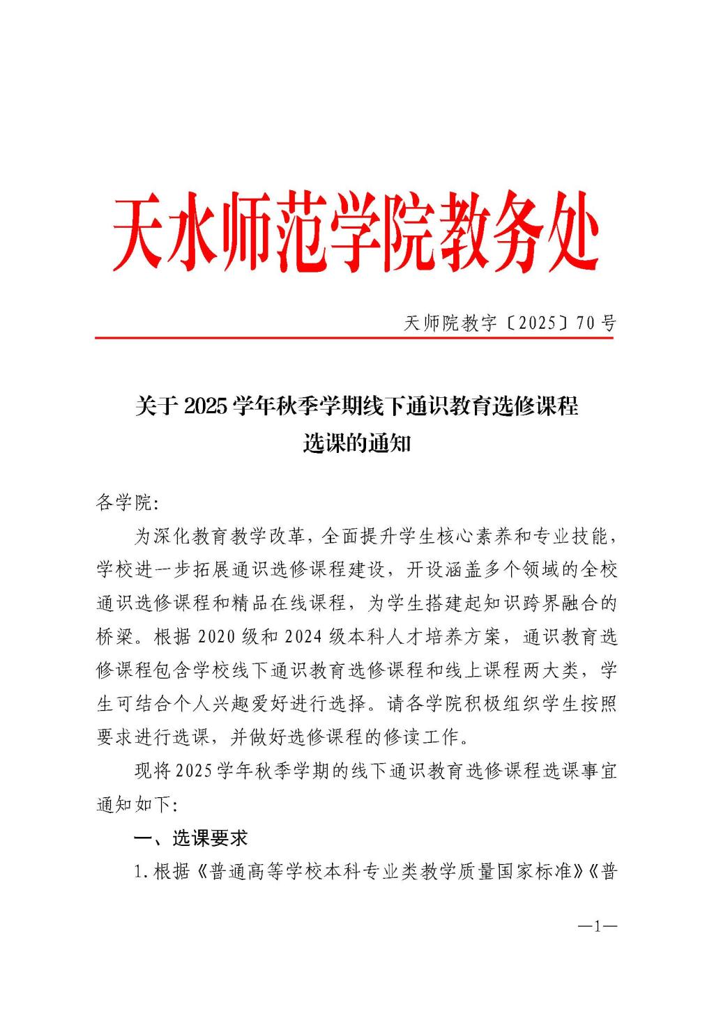 关于2025学年秋季学期线下通识教育选修课程选课的通知